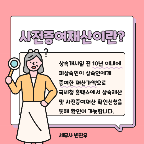 상속개시일 전 증여한 재산가액(사전증여재산)이 있는 경우 상속세 신고 시 상속세 과세가액에 합산하여 상속세를 계산하게 됩니다. 사전증여재산에는 어떤 내용이 있는지 신고하지 않은 사전증여재산은 어떻게 반영하는지 등의 상속세 신고방법에 대하여 변찬우 세무사가 알려드릴게요.