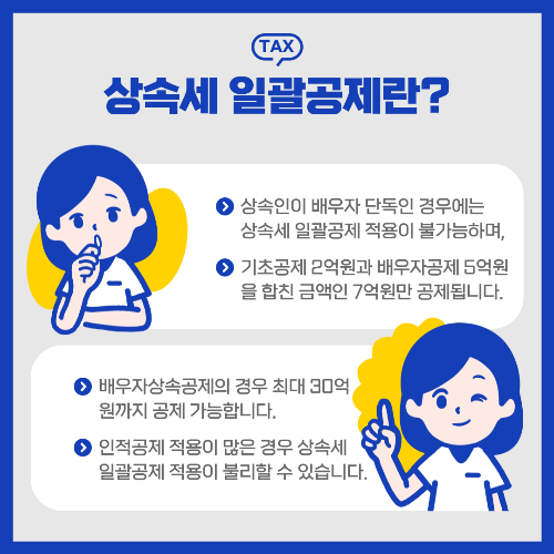 상속세 일괄공제 적용 시 배우자상속공제와 같이 상속세 인적공제 적용이 가능하여, 상속인 중에 배우자가 있는 경우에는 상속세 일괄공제 5억원과 배우자상속공제 5억원을 합한 금액인 상속재산 10억원까지는 상속세 납부세액이 나오지 않습니다.