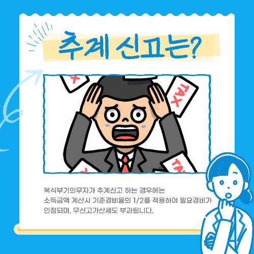 복식부기의무자인 경우 대부분 세무기장을 통하여 신고하게 되며, 간편장부대상자인 추계신고시 기준경비율 대상자인 경우에는 세무기장을 통한 신고가 유리한 경우가 많습니다. 간편장부대상자이면서 단순경비율 신고인 경우에는 국세청으로부터 자동채움 신고서가 발송되는 경우가 많으며, 사업과 관련된 적격증빙을 많이 받지 못한 경우 추계신고가 유리한 경우가 많습니다. 반면에 복식부기의무자는 추계로 소득금액 계산시 기준경비율의 1/2를 적용하여 필요경비를 계산(소득령§143③1호 다목 단서)하며 무신고로 간주하여 무신고가산세도 부과되므로 추계신고가 불리한 경우가 많습니다.