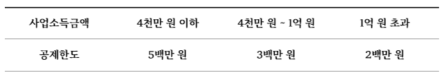 거주자 본인 명의로 소기업 · 소상공인 공제부금을 매분기별로 300만원 이하의 금액을 납입하는 경우 아래의 사업소득금액에 대한 공제한도 기준내에서 노란우산공제 적용이 가능합니다.