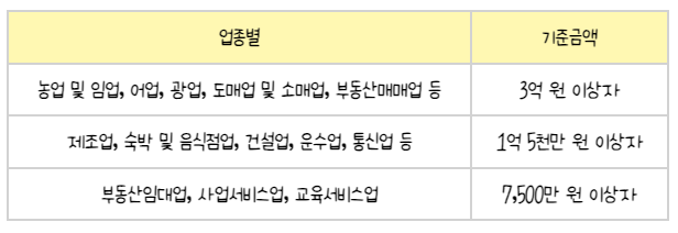 복식부기의무자 중에서도 업종별 기준금액이 2배 이상인 경우에는 외부조정대상자가 되어 세무사를 통한 신고를 하지 않는 경우 무신고로 보게 되므로 가산세 부담과 세액공제 및 감면이 적용이 되지 않는 경우가 발생합니다.