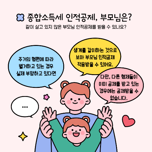 사업자의 부모님 뿐만 아니라 배우자의 부모님 공제도 가능하며, 주거의 형편에 따라 별거하고 있는 부모님의 경우에도 인적공제 적용이 가능합니다.