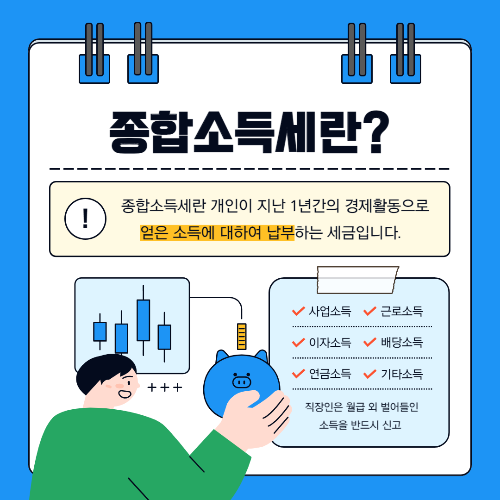 종합소득세 신고는 5월 1일부터 31일까지 전년도에 발생한 이자 · 배당 · 사업(부동산임대) · 근로 · 연금 · 기타소득 등을 종합하여 신고 및 납부하여야 합니다.