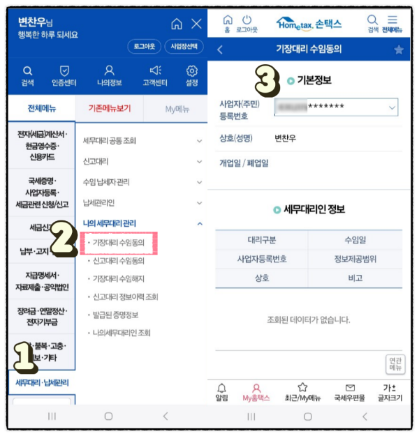 손택스 앱에서 ①세무대리·납세관리 탭에서 ②나의세무대리관리 ③기장대리수임동의를 클릭하여 '세무사 변찬우'에 수임동의합니다.