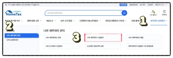 우측 상단의 ①세무대리 · 납세관리를 누르면 왼쪽에 ②나의세무대리관리 ③나의세무대리수임동의를 클릭합니다.