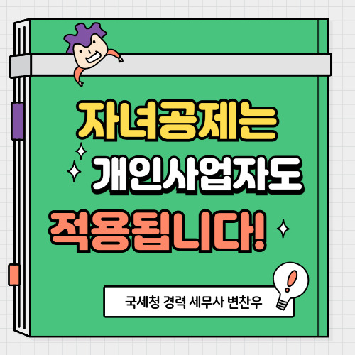종합소득이 있는 거주자의 공제대상자녀 및 손자녀로 자녀세액공제 금액을 종합소득산출세액으로 공제하는 구조라 연말정산이 필요한 근로소득자 뿐만 아니라 개인사업자도 자녀세액공제 적용을 받을 수 있습니다.