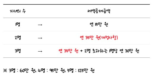 다만, 출산(입양) 한 공제대상자녀가 있는 경우 첫째 30만 원, 둘째 50만 원, 셋째 이상인 경우 연 70만 원을 종합소득 산출세액에서 공제받게 됩니다.
