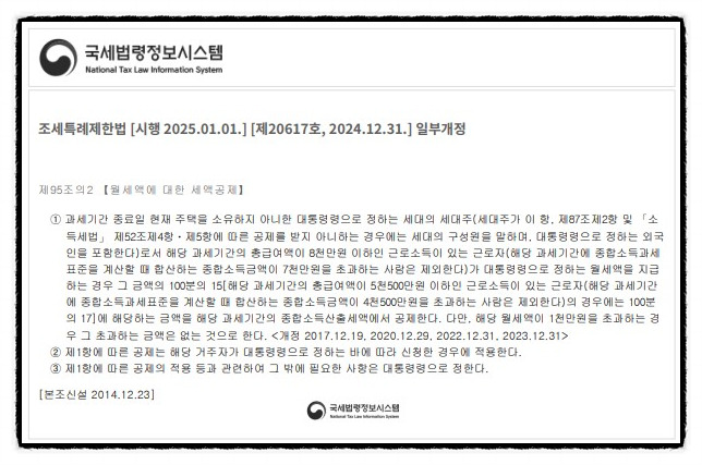 ①무주택 세대의 세대주(단독세대주 및 일정요건의 세대원 포함)로서 ②총급여액이 8천만원 이하인 근로소득이 있는 거주자가 ③국민주택규모의 주택 또는 기준시가 4억 원 이하 주택(주거용 오피스텔, 고시원 포함)을 임차하기 위하여 ④지급하는 월세액(연 1천만 원 한도)의 15%(17%)에 해당하는 금액을 종합소득산출세액에서 공제한다. (조특법 제95의2)