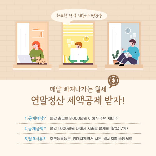총급여액이 8천만 원 이하인 근로소득이 있는 무주택 세대의 세대주인 거주자가 일정 요건을 충족하는 경우 연말정산 월세공제를 받을 수 있습니다. 연말정산 월세액 공제방법과 제출서류 등 자세한 내용을 변찬우 세무사가 알려드릴게요.