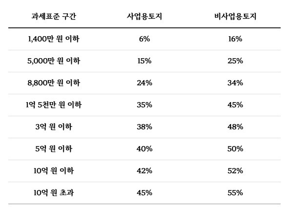참고로 비사업용토지 양도세율은 아래와 같습니다.