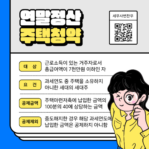 근로소득이 있는 거주자가 본인 명의로 해당 연도에 주택청약종합저축(청약저축 포함)에 납입한 금액의 40%가 근로소득에 공제받을 수 있습니다. 연말정산 주택청약 소득공제에 대하여 자세한 조건과 올해 달라진 내용을 변찬우 세무사가 알려드릴게요.