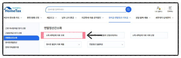 장려금·연말정산·기부금 탭에서 연말정산간소화 소득·세액공제 자료 조회를 클릭합니다.