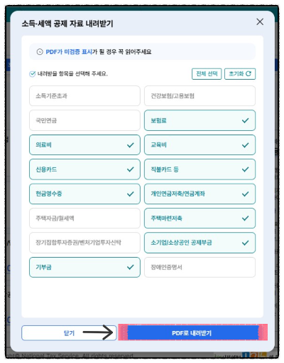 연말정산간소화에서 제공하는 자료는 영수증 발급기관이 제출한 자료를 그대로 보여주므로 공제 요건 충족 여부는 근로자 스스로 확인하여야 합니다.