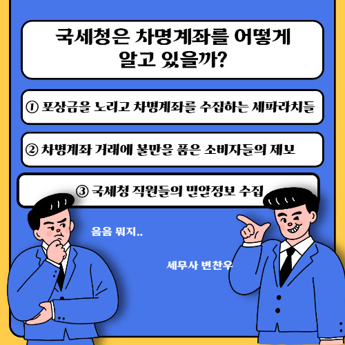 국세청은 차명계좌 사용에 대하여 국세청 홈택스나 전국 세무서를 통하여 탈세제보를 접수하고 있으며, 신고된 차명계좌를 통해 탈루세액이 1천만 원 이상 추징되는 경우 건당 100만 원의 포상금을 지급하고 있습니다. 차명계좌 해명안내문은 ①신고포상금을 노리고 인터넷 등에서 차명계좌를 수집하고 있는 세파라치들, ②불특정 다수와 거래하는 사업자의 경우 거래에 불만을 품은 소비자들, ③국세청 직원들은 주기적으로 밀알정보라고 하여 사업자들의 탈세자료를 자체 수집하고 있습니다.