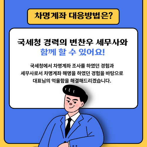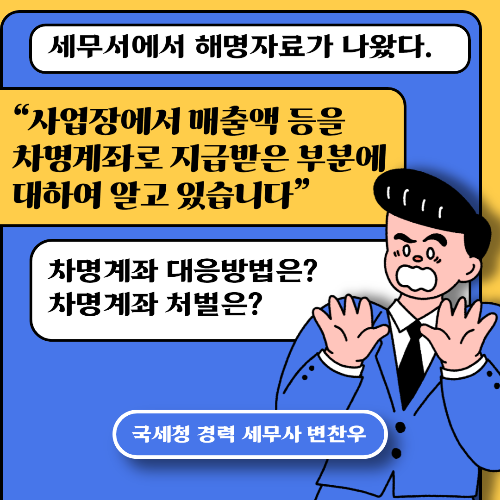 본인의 사업용 계좌를 사용하지 않고 가족이나 직원 등 다른 명의의 계좌를 사용하는 경우 국세청으로부터 차명계좌 해명자료 제출 안내문을 받아보게 됩니다. 갑자기 세무서로부터 차명계좌 해명자료 제출안내문을 받게 되면 어떤 처벌을 받는지 대응을 어떻게 해야 되는지 변찬우 세무사가 알려드릴게요.