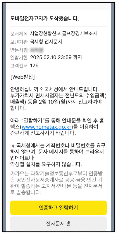 부가세를 신고하는 사업자는 1년에 2번(간이과세자는 1년에 1번) 부가세 신고를 통하여 매출과 매입을 파악할 수 있지만 면세사업자는 부가세 신고를 하지 않기 때문에 사업장현황신고를 통하여 매출과 매입을 파악하게 됩니다. 올해에는 사업장현황신고 골프장경기보조자라는 형식으로 캐디 사업장현황신고를 하라고 아래와 같은 안내 카톡이 발송되었습니다.