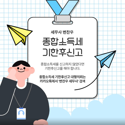 종합소득세 신고를 하지 않았다면 종합소득세 기한후신고를 해야 합니다. 종합소득세 기한후신고는 종합소득세 수정신고와 비슷한 개념이며 국세청에서 고지서를 발송하기 전까지 신고할 수 있습니다. 납부지연가산세를 줄이려면 종합소득세 기한후신고는 하루라도 빨리하는 것을 추천드립니다.