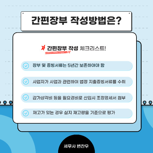 국세청 간편장부는 거래가 발생한 날짜 순서대로 매출액 등 수입에 관한 사항, 매입액 등 비용 지출에 관한 사항, 고정자산의 증감을 기록하면 됩니다.