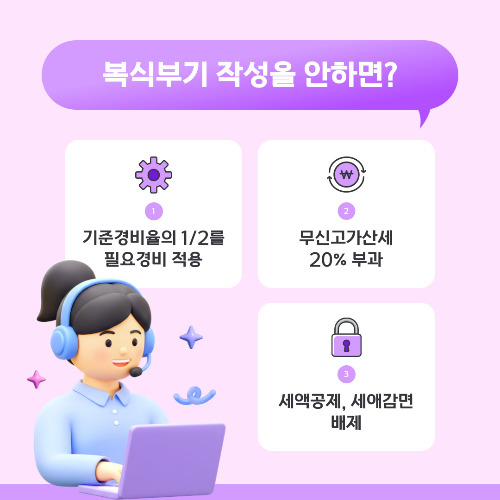 따라서 복식부기의무자는 복식부기 작성을 하는 것이 매우 중요하며, 이를 위반할 경우 상당한 불이익을 받을 수 있습니다.