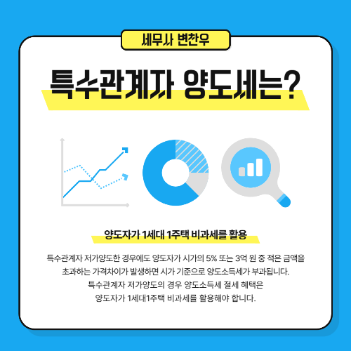 특수관계자 저가양도한 경우 양도자(매도자)는 시가의 5% 또는 3억 원 중 적은 금액을 초과하는 가격차이가 발생하면 시가를 기준으로 양도소득세가 부과됩니다. 따라서 특수관계자 저가양도의 경우 양도소득세 절세 혜택은 양도자가 1세대 1주택 비과세일 때 가장 절세 혜택이 큽니다. 1세대 1주택 비과세는 국내에 주소나 거소가 있는 거주자에 한하여 적용하므로, 비거주자의 주택에 대해서는 비과세 규정이 적용되지 않으므로 주의가 필요합니다.