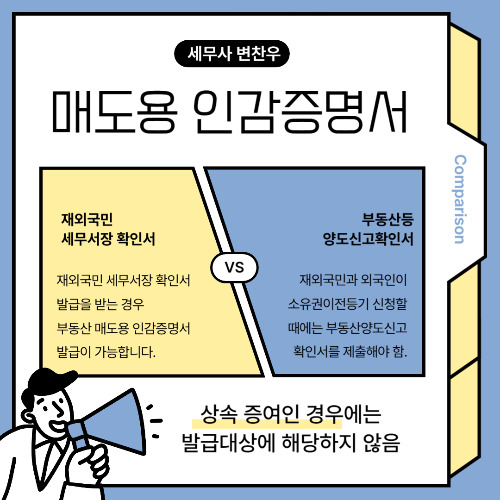 외국인 또는 내국인의 재외국민이 대한민국 내에 소재하는 부동산을 양도하는 경우 세무서장으로부터 확인을 받아야지만 매도용 인감증명서 발급이 가능합니다. 부동산을 양도하는 경우 세무서장으로부터 부동산양도신고확인서(외국인 인감증명서)를 왜 받아야 되는지 절차가 어떻게 되는지 변찬우 세무사가 알려드릴게요.