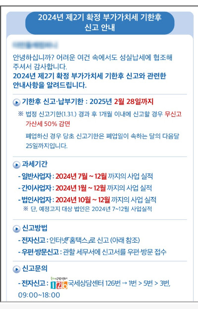 폐업을 한 뒤에도 부가세 신고를 하지 않는다면 국세청으로부터 아래와 같은 부가세 기한후신고 안내문을 받아보게 되며, 신고기한 후 1개월 이내에 부가세 기한후신고를 하는 경우 무신고가산세 50% 감면도 가능합니다.