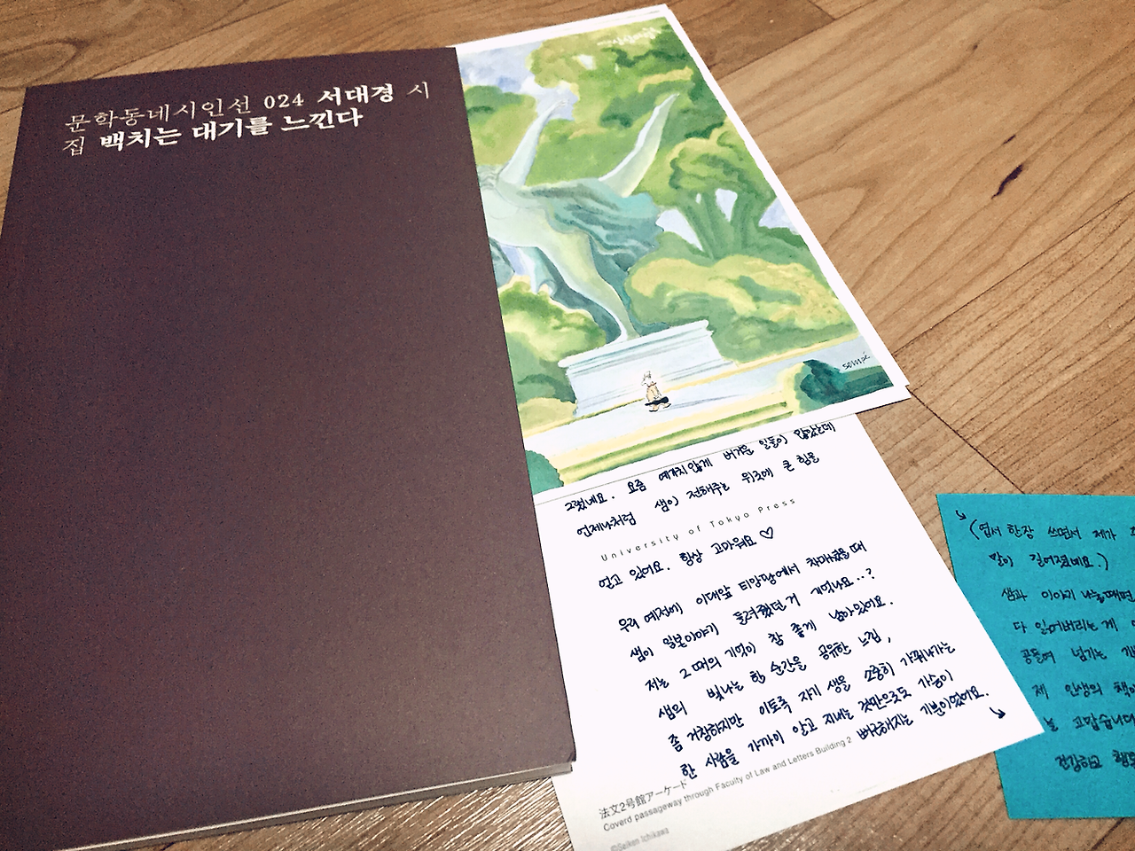 오늘도 한 동료에게 책을 선물 받았다. 집에 돌아와 이제는 익숙한 절차처럼 책 사이에 가지런히 꽂아 둔 엽서를 들여다 본다. 이번에는 두 장의 엽서가 있었는데 한 장은 장자크 상페를 좋아하는 나를 배려한 상페 그림 엽서였고, 또 한 장은 이번에 출장 차 다녀 왔다던 동경대 사진이 담긴 것이었다. 그것만으로도 충분했다. 그녀의 정성은 언제나 커다란 선물이었으니까. 그리고 뒷면을 채운 그녀의 손편지를 읽기 시작했다.