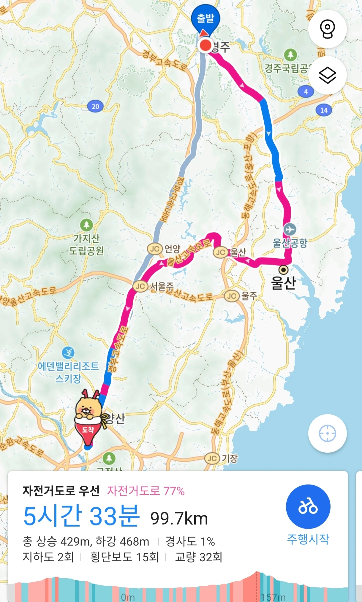 경주에서 울산으로 돌아 양산으로 가는 길. 100km에 5시간 반이 찍히는 거리였다.