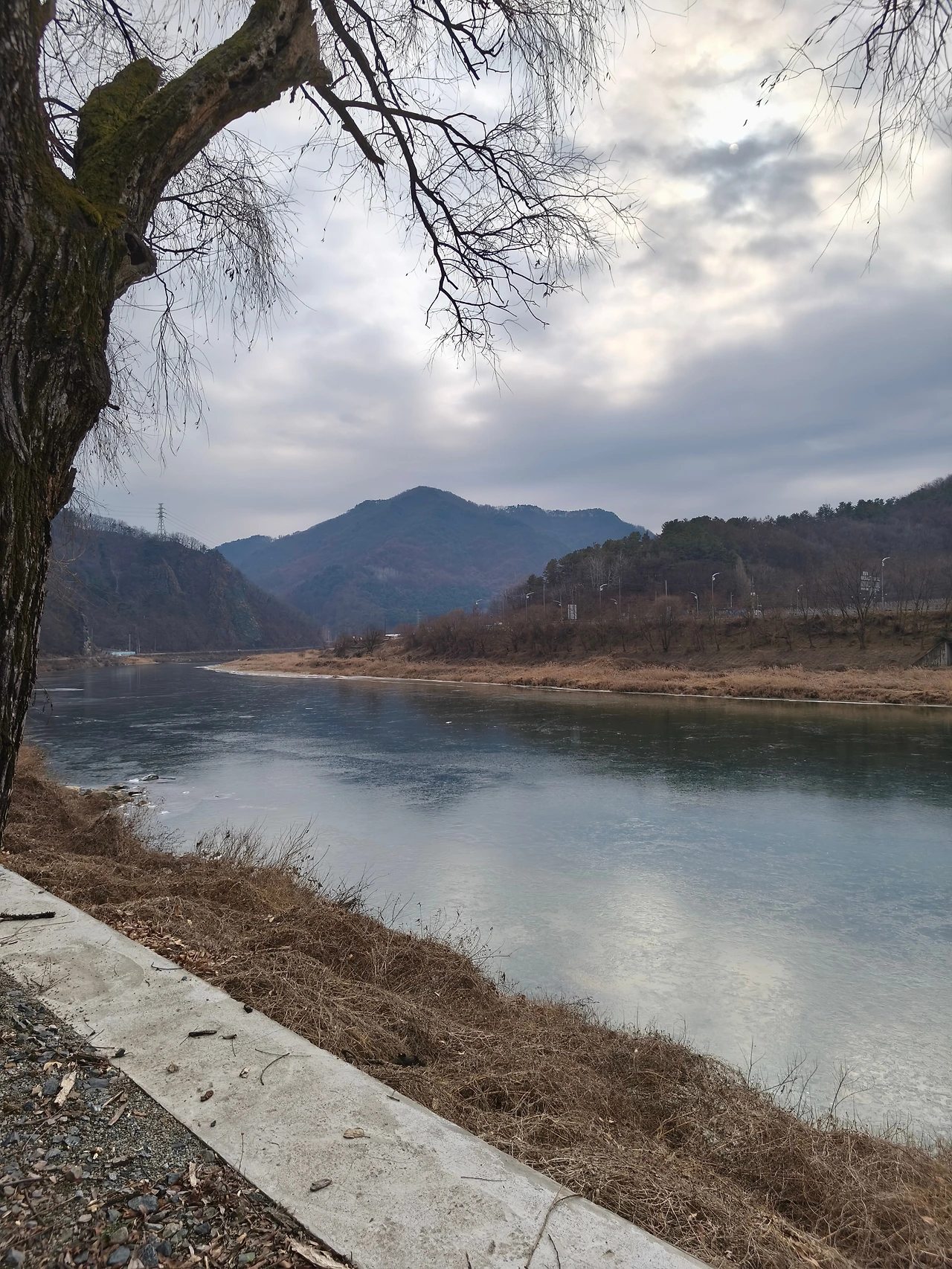 얼어 있는 강 옆 자전거도로로 계속 걸었고, 점점 커지는 물집과 통증은 참을 수밖에 없었다.