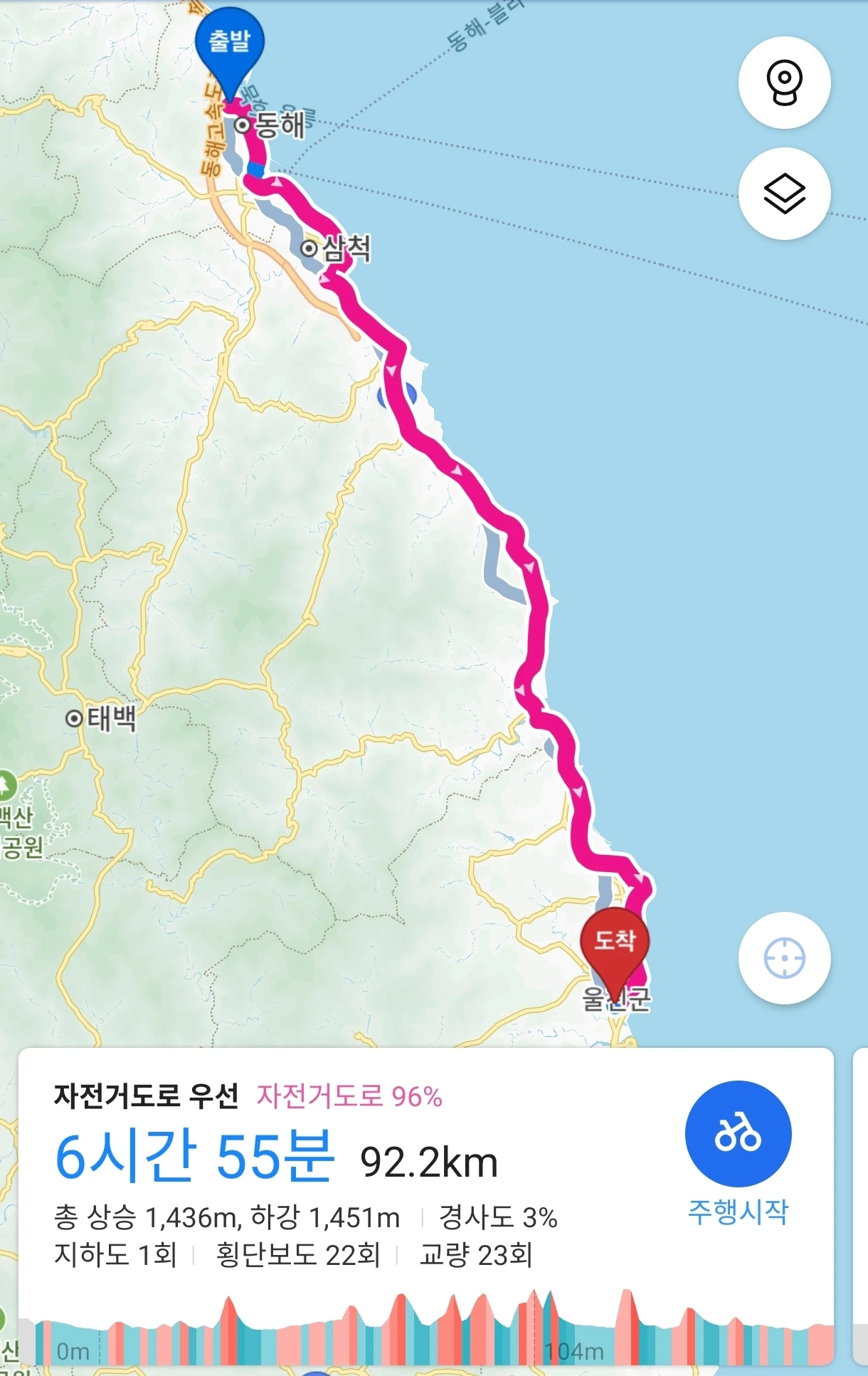 속초 - 동해 구간은 바퀴가 터지는 바람에 88km를 달렸고, 두 번째 동해-울진 구간은 다행히 바퀴 문제가 없어 94km를 달렸다. 하지만 어깨가 터졌다..