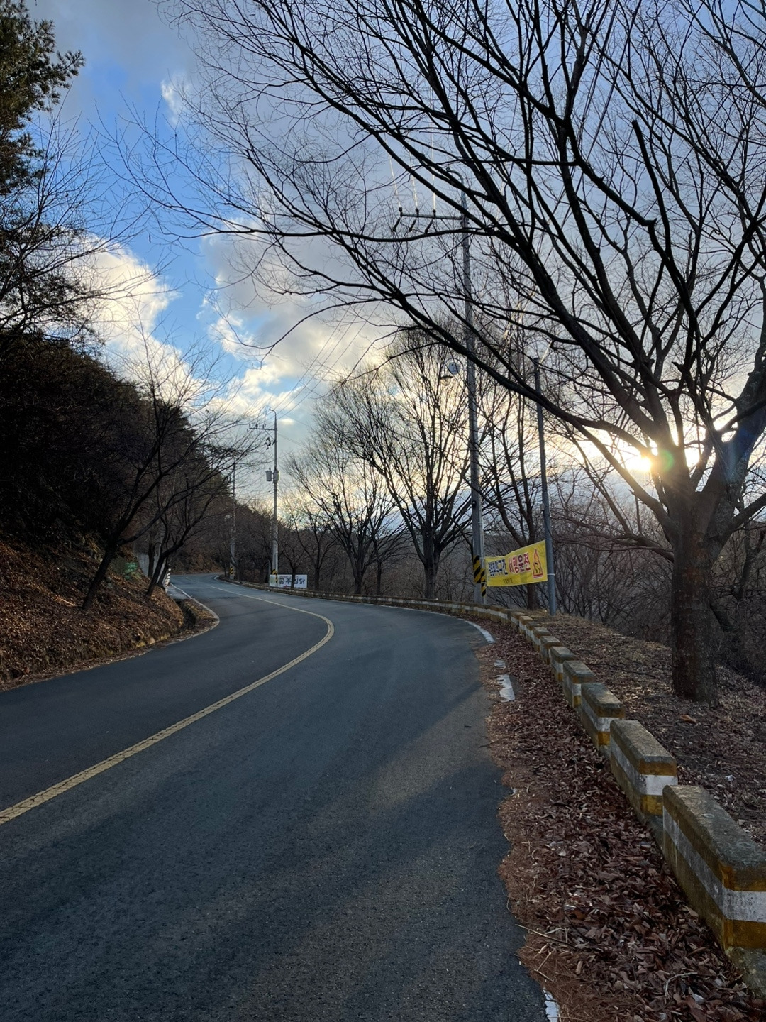 전날 소주 4병으로 과음을 한 터라 시작부터 제정신이 아니었다. 추운 줄도 모르고, 거리가 먼 줄도 모르고 무작정 출발하였던 것이다. 첫째 날 아침은 김밥 한 줄이었다. 자르지도 않은 통 김밥을 씹으며 대구 남구에 있는 산을 끼고돌았다(김밥을 먹으면서 눈물을 흘린 건 안 비밀). 뭐든지 할 수 있을 것만 같은 자신감. 발걸음도 가벼웠고, 날씨도 경치도 모든 것이 좋았다. 사람 구경도 하고, 자연 구경도 하면서 점점 대구에서 멀어졌다. 차들이 다니는 도로가를 걸으며, 어느덧 가창에 이르렀다.