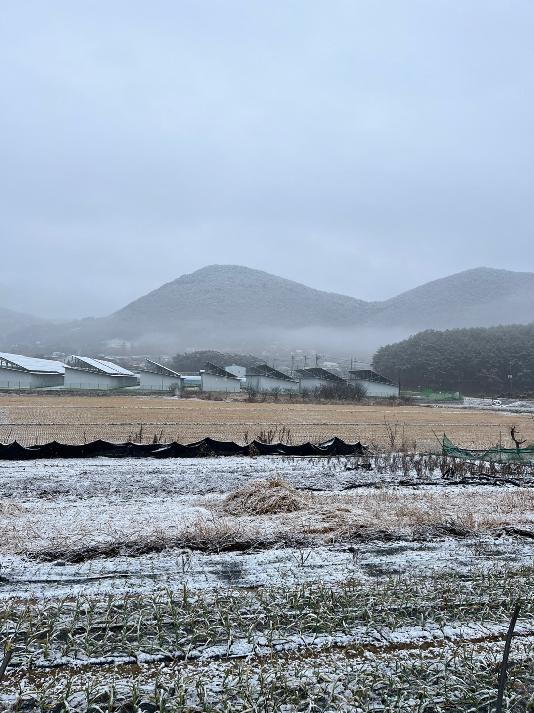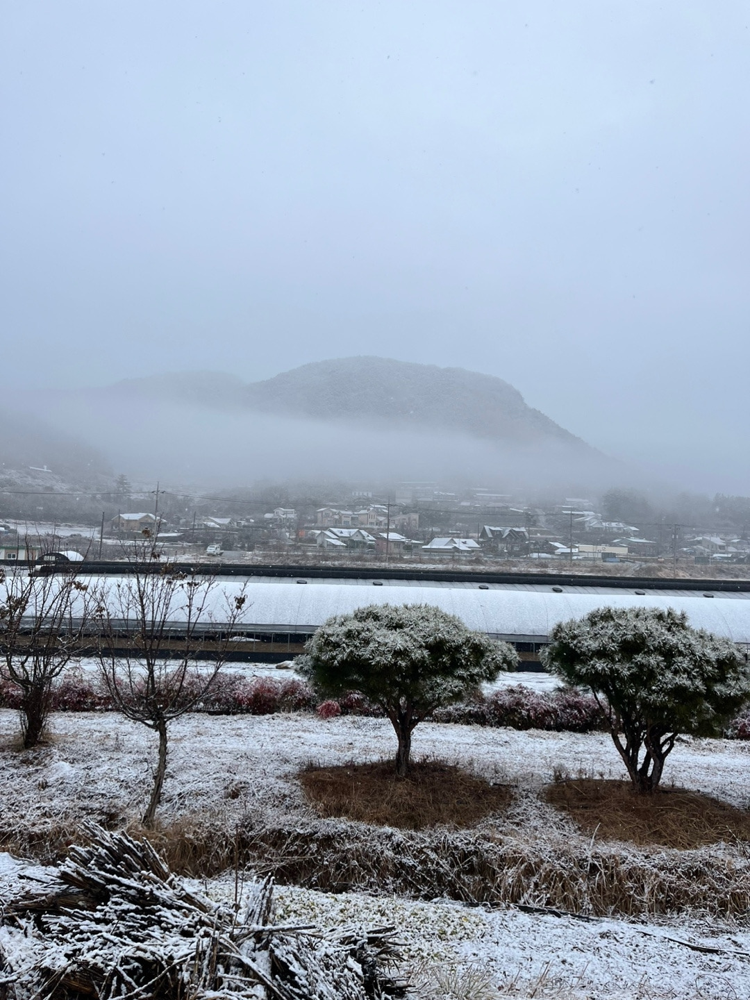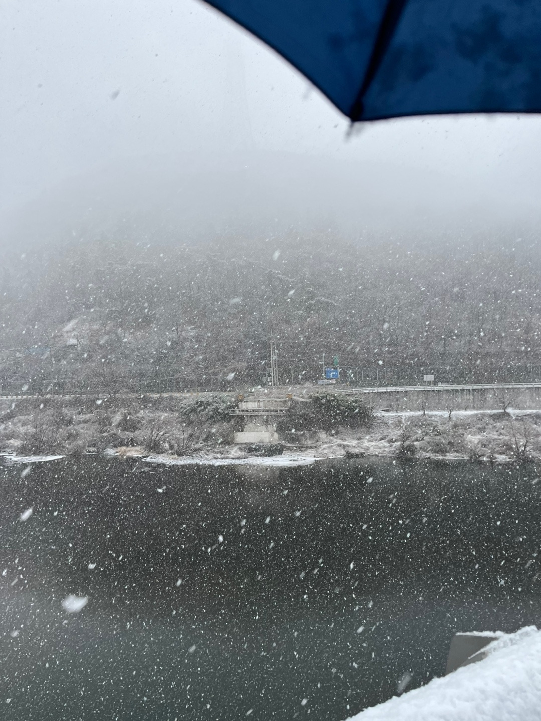 다음 날 새벽부터 긴급 문자가 계속 왔다. 눈이 오니 조심하라는 것. 아니나 다를까. 아침 7시 반에 출발하려고 보니 하늘에서 눈이 펑펑 내렸고, 온 세상이 이미 하얗게 되어 있었다. 나는 고민 끝에 우비로는 가방을 덮고, 우산을 들고 길을 나섰다. 눈 내리는 시골길이라니. 어떻게 보면 궂은 날씨를 안 좋게 생각할 수도 있지만, 나는 눈이 오는 트레킹을 경험할 수 있어서 너무 좋았다. 한 손에는 우산을 들고, 한 손에는 스틱 두 개를 들고 걷다가 한 손으로 우산과 스틱 2개를 다 잡고, 다른 손으로 휴대폰을 켜서 사진을 찍으며 바쁜 걸음을 걷기도 했다.