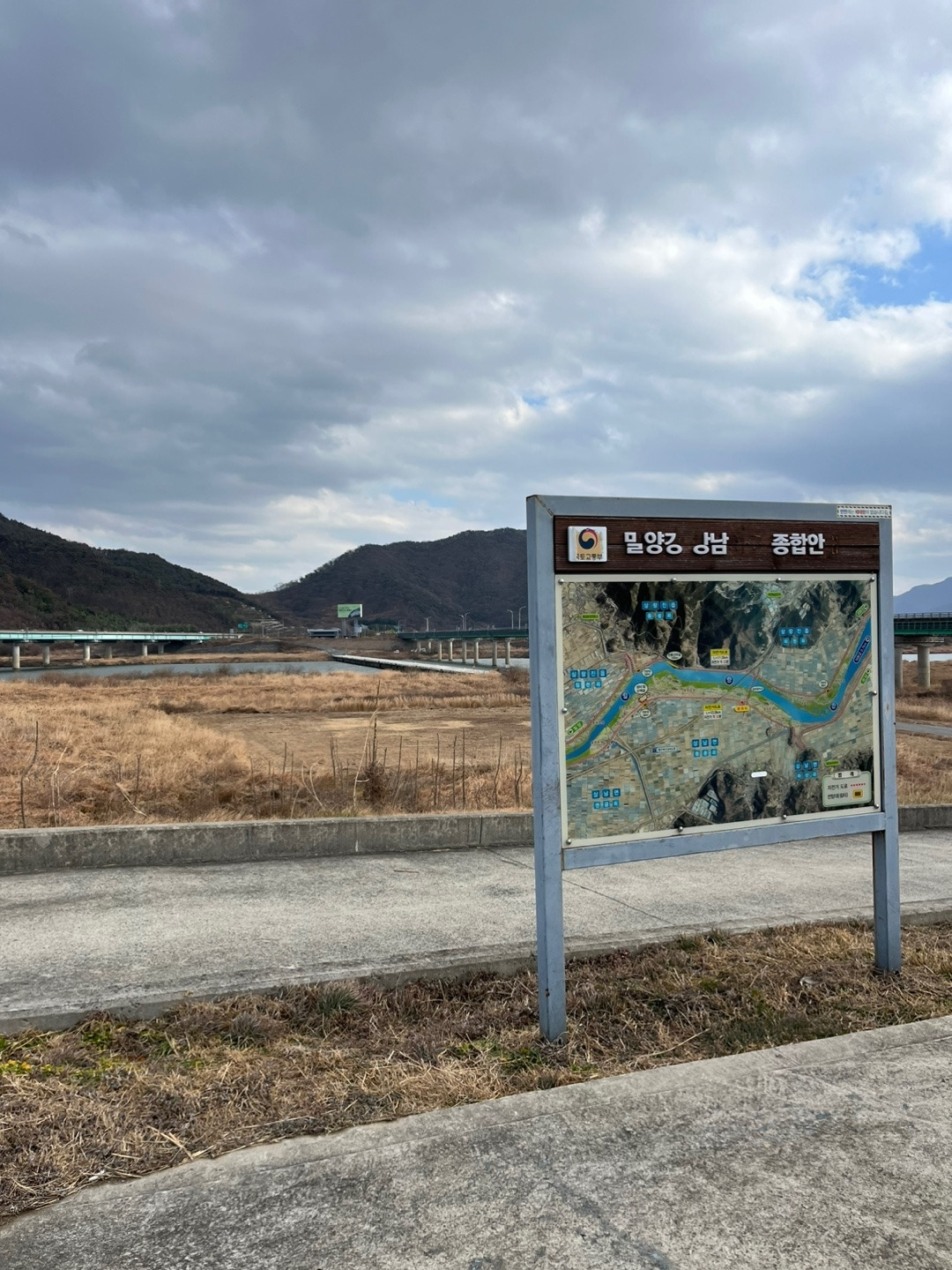 밀양 쪽으로 내려가는 길에는 도로 옆에 자전거 도로가 잘 되어 있어서 안전하고도 풍경을 보면서 걸을 수 있었다. 눈은 점점 잦아들었고 비로 바뀌었다. 눈이 내린 시골의 풍경을 보며, 밀양강을 보며 그렇게 걸었고, 밀양 시내쯤에 도착했을 때는 비도 그쳐 있었다.