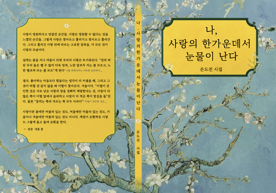 시집의 제목은 <나, 사랑의 한가운데서 눈물이 난다>로 정했고, 이 문구는 '내밀(內密)'이라는 저의 시의 문구의 일부를 따온 것입니다. 편집은 <앱솔루틀리 낫띵>을 한 번 내봤기 때문에 어렵지 않았고, 표지의 그림도 반 고흐의 꽃피는 아몬드 나무 (Almond Blossom, 1890)로 생각을 해 두었기 때문에 어렵지 않게 만들었습니다. 시의 느낌과 잘 어울리는 표지라고 생각했고, 제 마음에도 들었습니다.