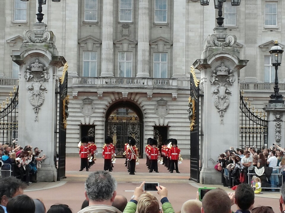 오후일정을 짜며 카페에서 시간을 보내다 보니 시간이 훌쩍 지났다. 시계를 보니 이제 정말 시간이 얼마남지 않아서 부랴부랴 카페를 나섰다. 아니나 다를까 이미 버킹엄궁전 앞은 이미 만석이었다. 아침일찍 왔건만 좋은 자리는 다 뺏기는 바람에 조금은 억울한 마음이 들었지만 덕분에 좋은 카페에서 맛좋은 음료도 맛볼 수 있어서 그것으로 만족했다. 시간은 거의다 되어가서 우리도 대충 길가쪽에 자리를 잡았다. 불과 한시간전만해도 휑 하던 거리가 사람들로 꽉찬 것을 보니 도대체 이 많은 인파가 어디에서 왔는지 신기했다.