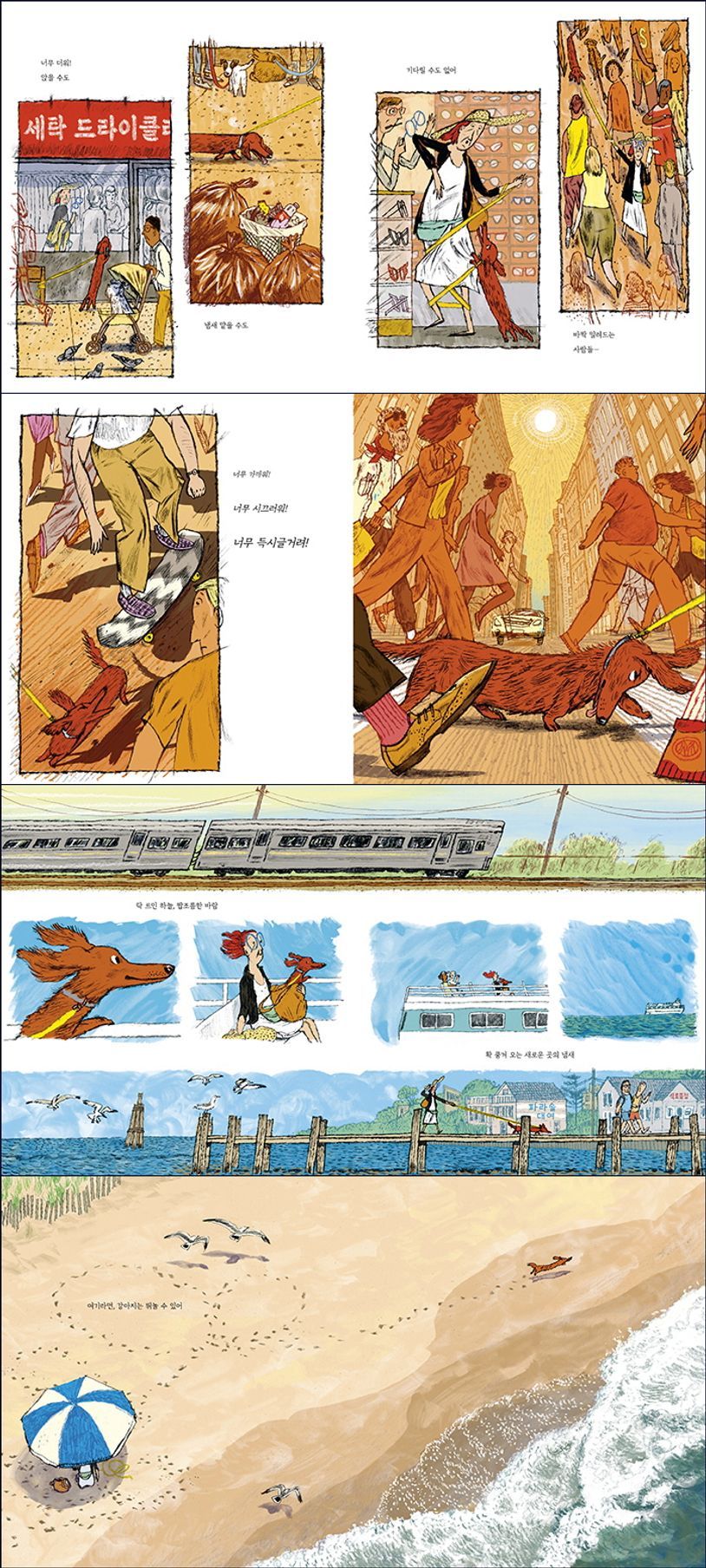 '핫도그'는 2023 칼데콧 수상작으로 도시의 여름에 지친 강아지와 주인이 휴가를 떠나는 내용이에요.