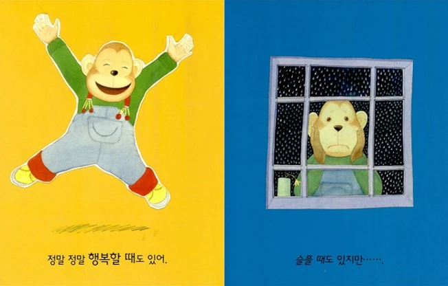 지금 보신 것처럼 앤서니 브라운의 '기분을 말해 봐!' 는 배경색과 인물의 색을 사용해서 기분을 말하고 있어요.