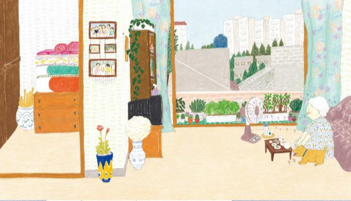요즘 저희 아이가 완전히 매료되어 매일 읽자고 들고 오는 그림책이 있어요. 안녕달 작가님의 '할머니의 여름휴가'인데요. 이 책은 할머니와 강아지(메리)가 더운 여름날 방에 앉아 있는 모습으로 시작합니다. 이 장면은 글이 없고 그림만 있어요.