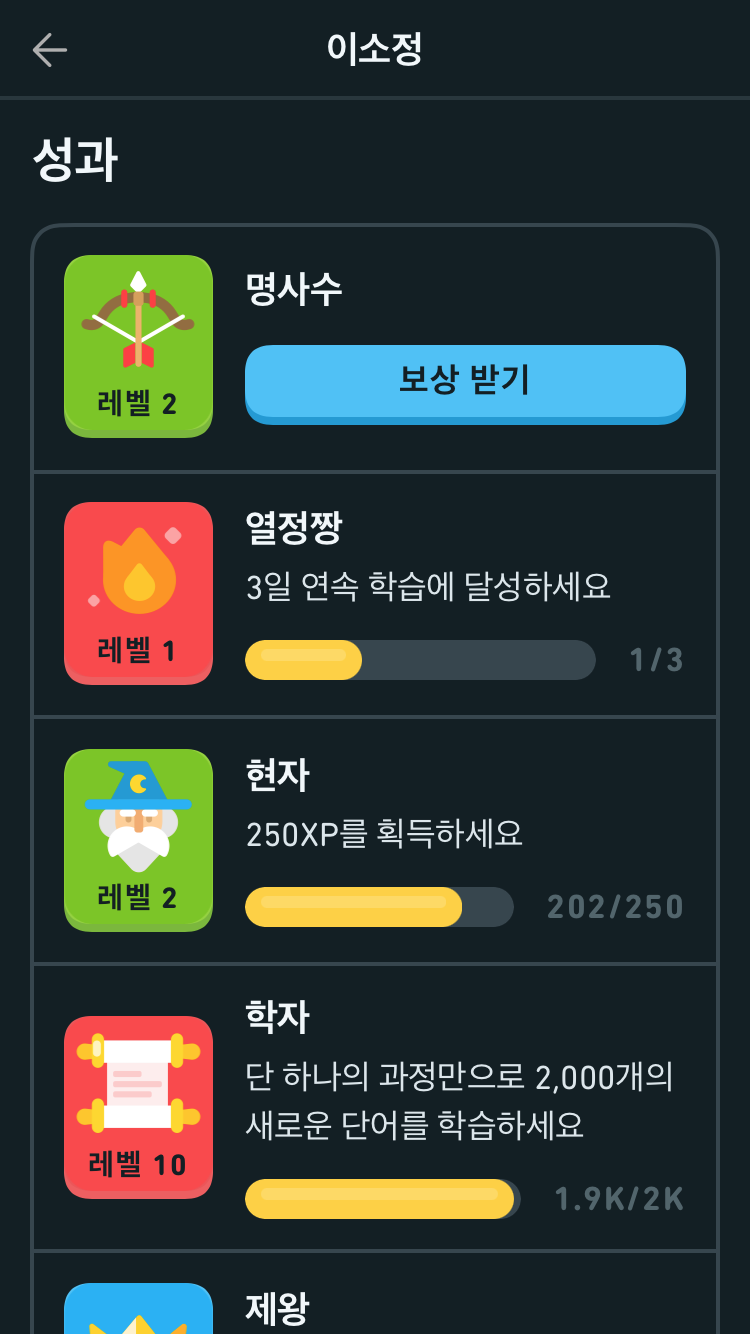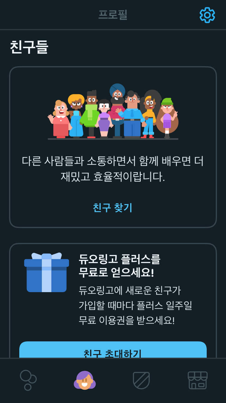 프로필 화면을 보면, 네 파트로 나눠서 나름 정보를 덩어리 처리하여 제공하려고 했다. 첫 번째 덩어리에서는 이름과 고유 아이디, 가입 날짜, 친구 수, 위치, 배우는 언어, 프로필 사진을. 두 번째 덩어리에서는 학습 통계 정보로 연속 학습 날짜, 총 XP(경험치), 총 왕관 수(완료한 혹은 시험을 통과한 레슨 개수), 리그를 알려준다. 세 번째 덩어리는 친구 찾기와 초대하기 기능이 있고, 다음 덩어리는 성과 덩어리로 10개의 항목에서 내가 어느 정도씩 성취를 했는지 확인할 수 있다. 하지만 초반에 통계가 무엇을 가리키는지 익숙하지 않은 초반에는 다소 정보가 많은 것으로 느껴질 가능성이 높다. 사용자 추천을 늘리려는 앱의 의도로 생각되기는 하지만 친구들이 성과보다 먼저 있는데, 친구들 기능을 많이 활용하지 않는 사람으로서는 불편했다. 성과 또한 10개의 성과 배지가 한 번에 보이는 대신, 한번 더 터치해서 다음 화면으로 넘어가서 스크롤하도록 되어 있는데 터치해야 하는 버튼이 너무 많았고 한눈에 알아보기가 불편했다.