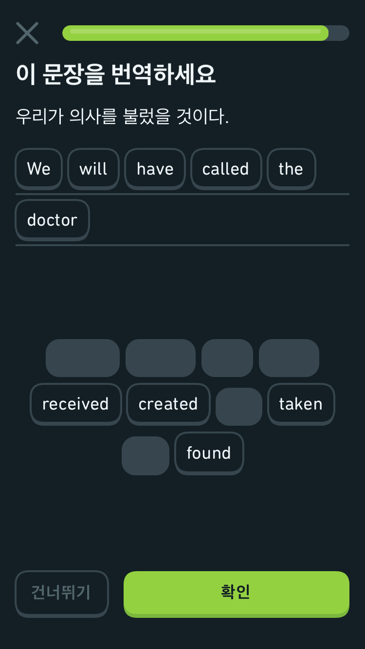 또한, 단어 덩어리를 선택해서 문제를 풀지 않고 키보드로 직접 문장을 입력하고 싶어 하는 유저를 위해서 키보드 입력 기능(Use Keyboard)과 단어 덩어리 선택(Use Word Bank)을 제공한다. 다만, 이는 영어를 배우는 한국어 사용자용 애플리케이션에는 없고, 스페인어를 배우는 영어 사용자용 웹페이지와 애플리케이션에서만 확인할 수 있었다. (한국어 사용자용 애플리케이션은 기능이 매우 적다. 언어도 영어만 제공 중이기 때문에 영어 학습 초보자라면 많은 도움을 받을 수 있겠지만, B2 레벨 이상의 영어 학습자에게는 도움이 안 되기도 한다. 중국어는 현재 개발 중이라고 하지만 기능이 적은 건 사실이다)