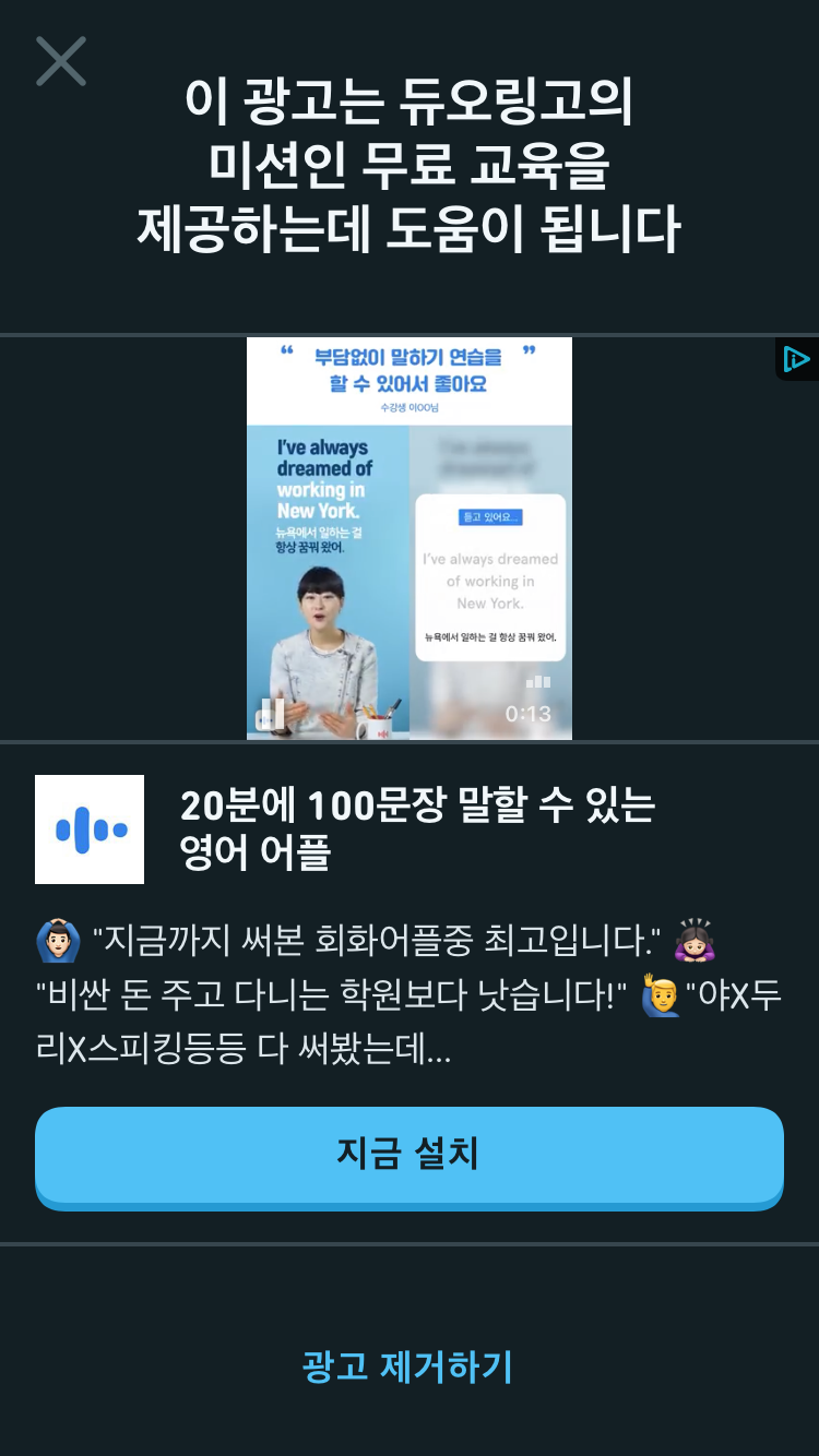 사용자 여정 중 가장 마지막 순간, 듀오링고에서는 매번 레슨을 하나 끝날 때마다 부정적인 경험이 이어진다. 먼저 일일 목표를 달성했다는 문구, 혹은 레슨 완료 문구가 나온다. 그 뒤에 몇 초 이상 봐야 하는 광고가 나오고, 그 광고가 끝난 뒤에도 광고 설치 화면으로 이어진다. 몇 초 이상 봐야 하는 동영상 광고가 나오지 않을 때도 있기는 하다. 그와 동시에 이 광고가 무료 교육에 기여하고 있다는 설명이 나오며, 맨 하단의 '광고 제거하기'를 통해 제거하는 옵션도 있다고 알려준다. 듀오링고 플러스로의 결제를 유도하려는 목적은 이해하겠지만, 무료 기능을 활용하는 사용자로서는 가장 성취감을 느끼고 다음 수업을 기약해야 하는 매 레슨 뒤에 광고가 나와서 조금 아쉽다.
