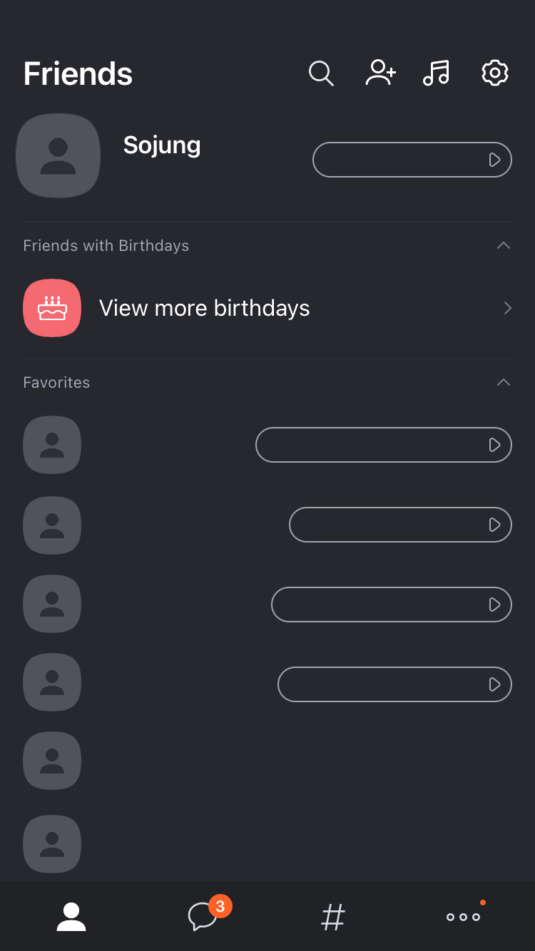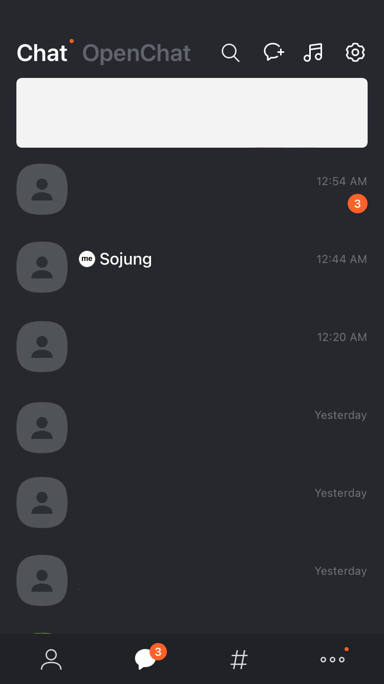 카카오톡에서 기본 정보만 남기고 다 지운 세 화면이다. 카카오톡 배경을 검은색으로 해서 화면 색도 다르고 영어로 해놨지만, 차례대로 친구 목록, 채팅창, 기타 화면이다. 당근마켓과 마찬가지로 맨 아래의 기본적인 아이콘, '친구 목록', '채팅창', '채널', '더보기'가 있고, 어느 화면에 있는지에 따라 아이콘의 색이 달라진다. 회색 사각형은 광고가 뜨는 화면인데 지웠다. 맨 위 우측의 '검색', '음악', '설정' 아이콘은 그대로인데, 어느 화면에 있느냐에 따라서 두 번째 아이콘이 '친구 추가', '채팅방 추가', 'QR 코드 스캔' 등 다른 기능을 나타내며, 다른 아이콘으로 보인다. 설정 아이콘은 어느 화면에 있는지에 따라서 기능이 달라지는데, 아이콘 대신 텍스트로 기능을 선택할 수 있도록 한다.