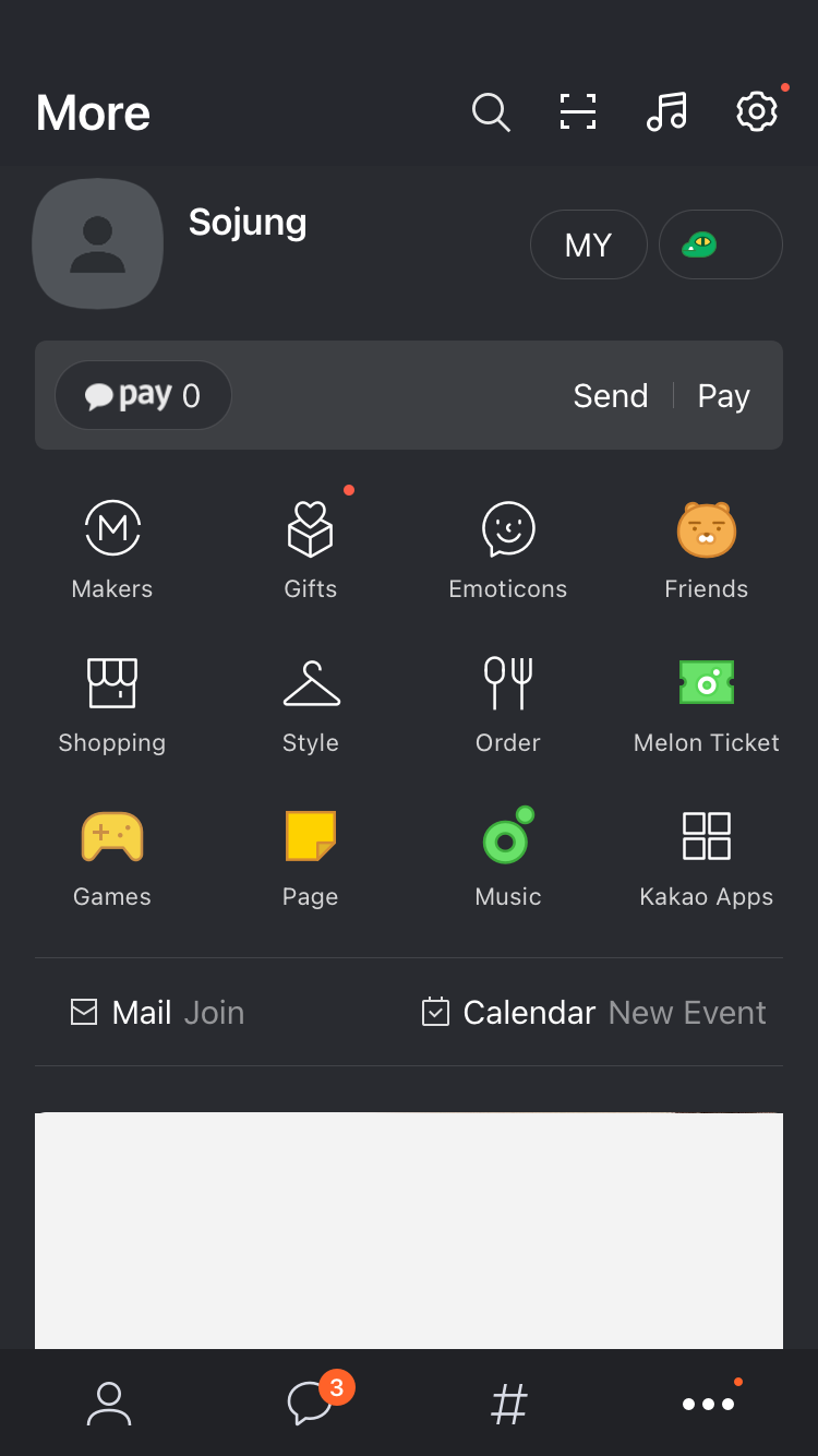 오랜 유저로서 카카오톡이 많이 바뀌었다고 생각될 때는 위의 '더보기' 화면을 볼 때다. 카카오페이, 카카오메이커스, 카카오선물하기 등 많은 기능이 추가되면서 이 기능을 모두 더보기에 몰아넣었는데, 정작 이 기능을 모두 사용해본 적은 없는 것 같다. 카카오톡 외부의 프로덕트가 들어오면서, 아이콘의 정체성이 그 프로덕트를 따라가다 보니 전체적인 아이콘의 아이덴티티가 달라지기도 해서 어쩔 수 없지만 아쉽다. 다만 자주 이용되는 기능인 카카오페이는 따로 위로 뺀 부분에서 가산점을 주고 싶다.