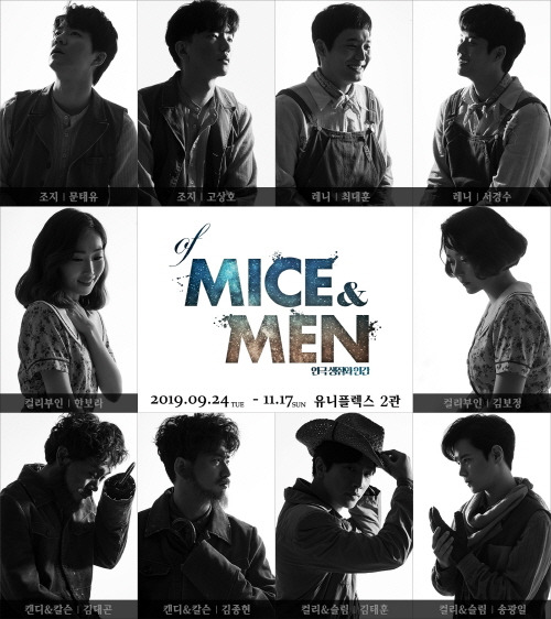 두 이주 노동자인 조지와 레니는, 2019년 9월 25일 기준으로 고상호 배우와 서경수 배우가 맡았다. 고 배우의 작은 키와 날카로운 눈매는, 영리하고 예민한 조지의 성격으로 그대로 이어진다. 서 배우는 큰 덩치와는 달리 어린아이의 지능을 가진 레니를 잘 구현해낸다. 말투까지도 레니 그 자체다. 이렇게 대조적인 조합의 조지와 레니는 서로 의지하며 살아간다. 힘을 조절하지 못하고 사고를 치는 레니를 조지는 지겹다고 말하지만, 정작 조지의 꿈, 자신만의 집과 농장을 가지고 싶다는 꿈을 지탱해주는 것은 레니다. 매번 조지의 꿈을 물어보기 때문이다. 레니의 뒷수습을 맡으며 2인분의 삶을 지키느라 늘 지쳐있지만, 조지는 레니가 우리의 집과 농장에 대해 말해달라고 할 때는 눈을 빛낸다.