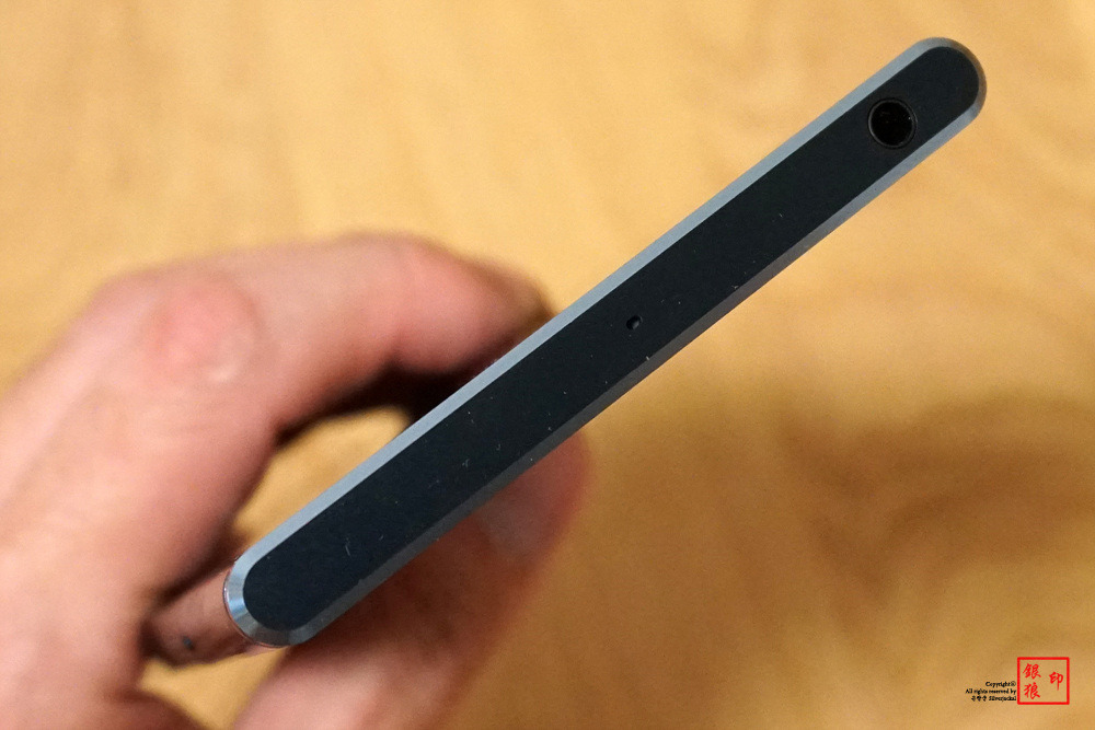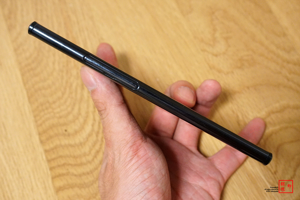 전면과 후면 모두 평평하고 매끈한데, 엑스페리아 X 퍼포먼스부터 쓰였던 2.5차원 강화유리를 써서 터치할 때 손 끝을 미끄러지는 느낌도 나쁘지 않고 전후면 모두 코닝 고릴라글래스5로 덮혀있어 보호필름 없이 사용해도 스크래치에 강한 면모를 보여줍니다.