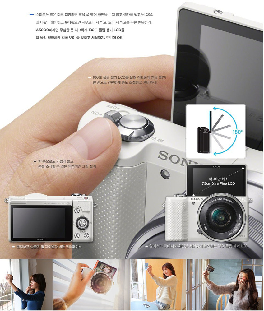 특히 180도까지 꺽이는 'A5000'의 플립 LCD는 셀카촬영에 최적의 환경을 제공합니다.