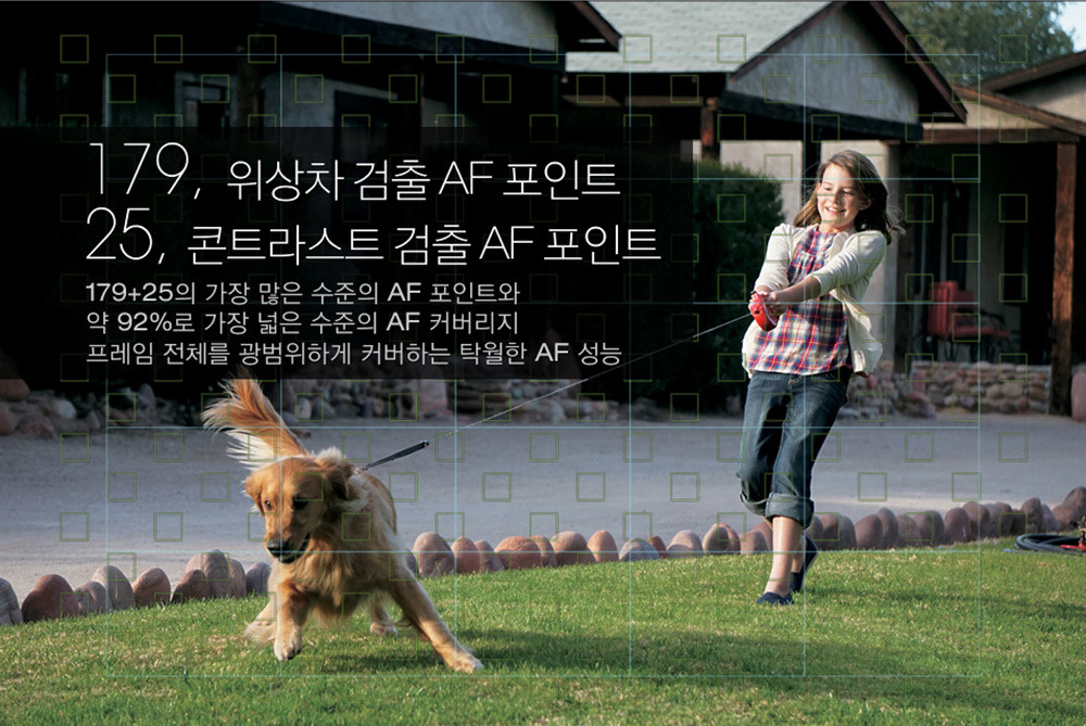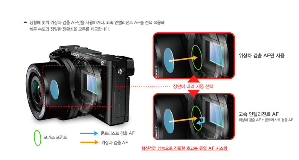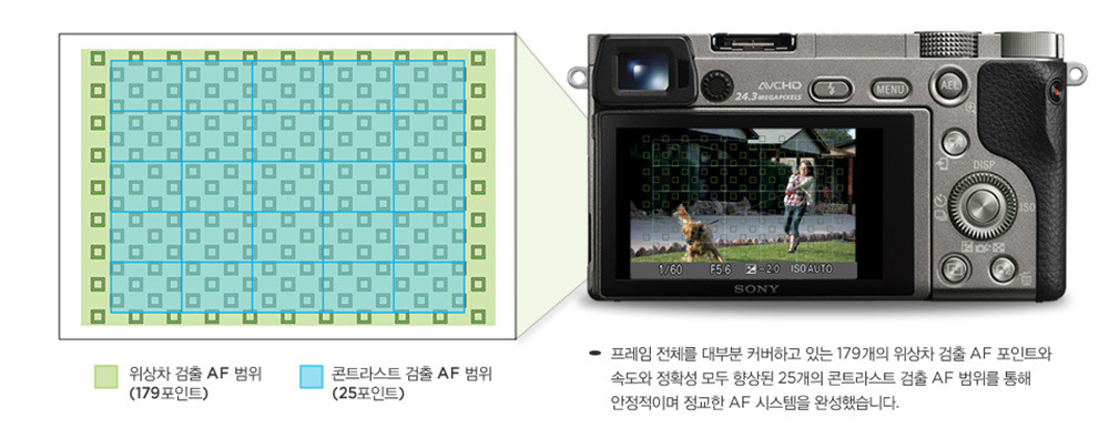 'A6000'의 AF 시스템입니다. 보급형의 최고급 모델인 'A5100'과 같은 AF시스템을 가지고 있는데요, 179개의 위상차 AF와 25의 컨트라스트 AF를 이용하여 센서의 92%를 커버합니다.