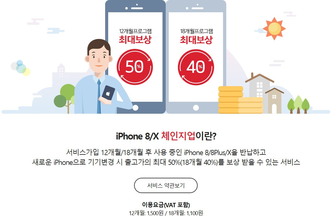 이번에는 KT입니다. '아이폰8/X 체인지업'이라는 프로그램으로 24개월 약정시 12개월 최대 50%, 36개월 약정시 18개월 후 최대 40%의 보상을 받습니다. 36개월 약정시 남은 할부금을 계산해보면 출고가의 10%는 자기 부담입니다.