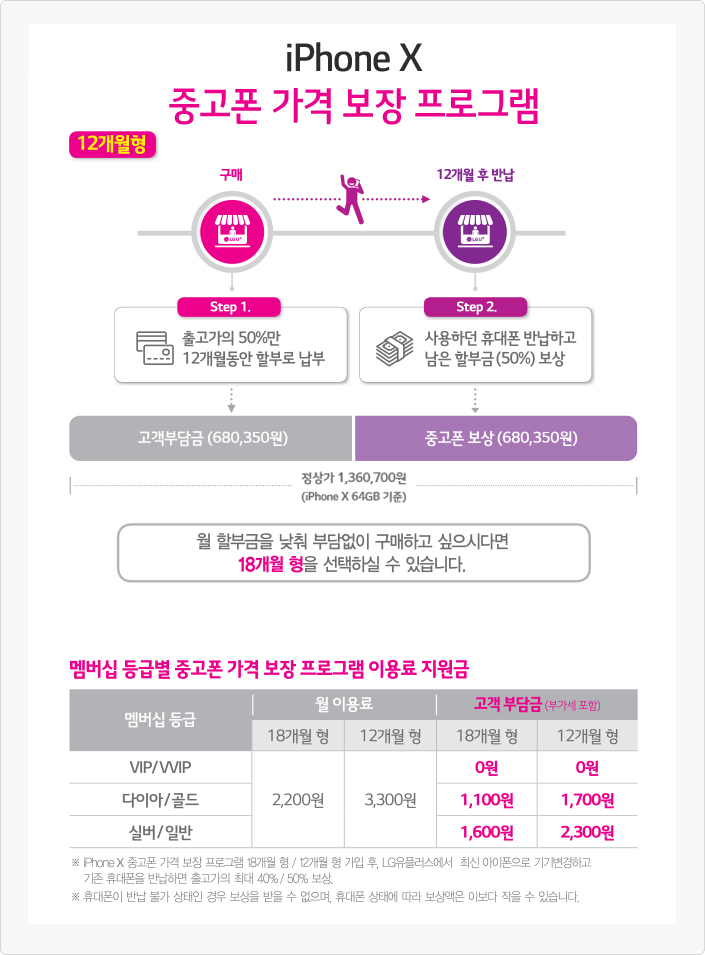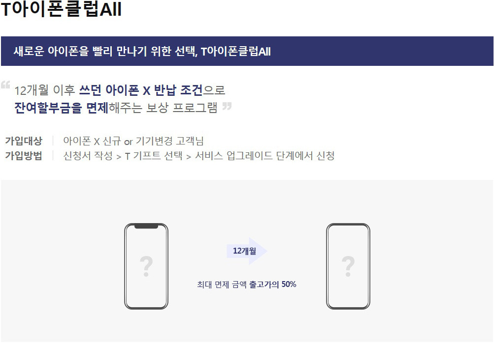 24개월 할부약정 후 12개월이 지난 시점 사용하던 아이폰X의 반납조건으로 최대 출고가의 50%를 감면하여 새로운 아이폰을 구입할 수 있도록 합니다. 한마디로 반납시 남은 할부금의 전부 또는 일부를 면제해 주겠다는 것이죠. 재미난 점은 최대 50%라는 것이고 50%를 보장 받지 못할 수도 있습니다.