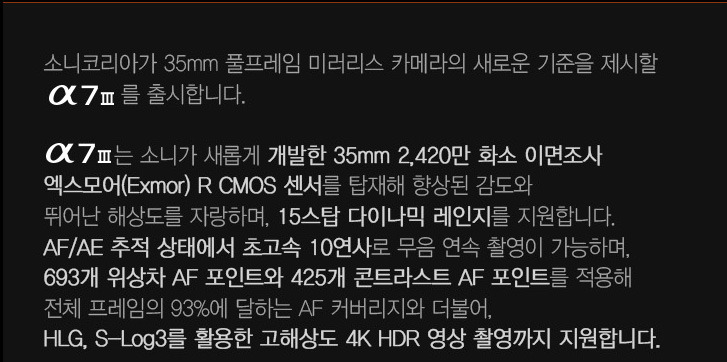 어느덧 이렇게 많아진 소니의 풀프레임 미러리스 카메라들인데요, 그 내용을 보면 A7M3(A7III)의 스펙이 상당한 고스펙이라는 것을 알 수 있습니다.